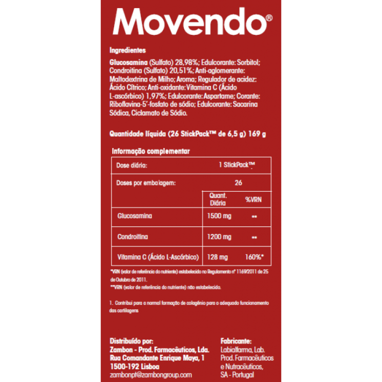 Glucosamina (Sulfato) 28,98%; Edulcorante: Sorbitol; Condroitina (Sulfato) 20,51%; Anti-aglomerante: Maltodextrina de Milho; Aroma; Regulador de acidez: Ácido Cítrico; Anti-oxidante: Vitamina C (Ácido L-ascórbico) 1,97%; Edulcorante: Aspartamo; Corante: Riboflavina-5’-fosfato de sódio; Edulcorante: Sacarina Sódica, Ciclamato de Sódio. Contém aspartamo, uma fonte de fenilalanina. Contém edulcorantes. O seu consumo excessivo pode ter efeitos laxativos.