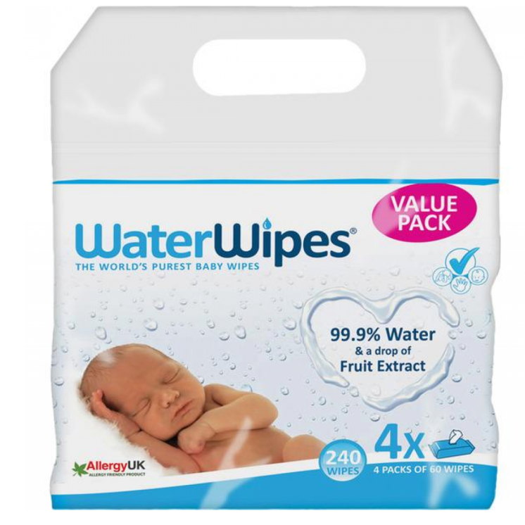 WaterWipes Toalhitas Bebé são toalhitas feitas apenas com dois ingredientes: água, especialmente purificada e amaciada e uma pequena gota de extrato de sementes de toranja.